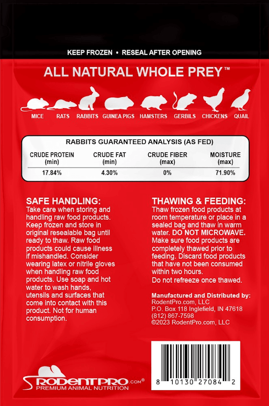 NOT FOR HUMAN CONSUMPTION. Rodents and other whole prey are potential carriers of zoonotic diseases such as salmonella. Consider wearing latex or nitrile gloves when handling raw foods. Thoroughly wash your hands, utensils and surfaces that come into contact with this product.