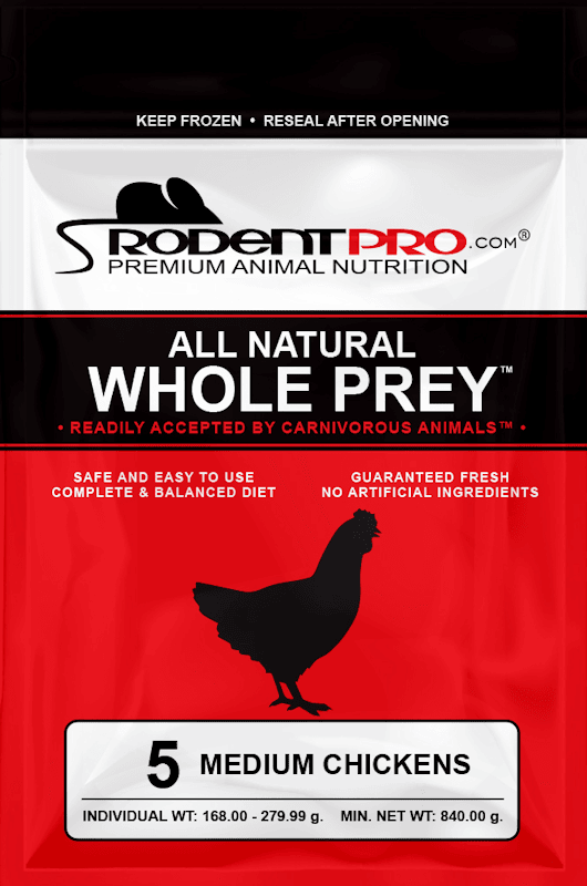 RodentPro.com sets the industry standards for quality, value and convenience by offering unsurpassed quality, breeder direct pricing and year-round availability of Medium Chickens. As a reptile breeder, zoo/aquarium curator or bird of prey owner you know that your animals' health and longevity are directly related to proper nutrition. RodentPro.com customers can be assured that all our animals are fed a scientifically designed and nutritionally complete diet resulting in a premium quality food item.