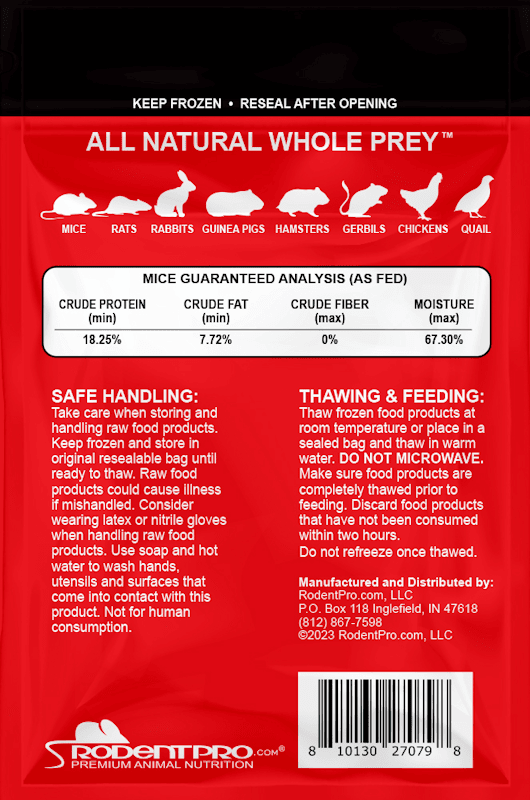 NOT FOR HUMAN CONSUPTION. Rodents and other whole prey are potential carriers of zoonotic diseases such as salmonella. Consider wearing latex or nitrile gloves when handling raw foods. Never eat, drink, or smoke when handling raw foods. Thoroughly was your hands, utensils and surfaces that come into contact with this product.